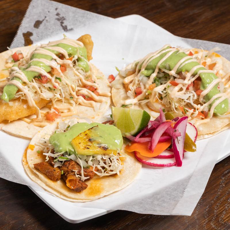 All Tacos are topped with onion/cilantro, salad(cabbage,tomato,cilantro mix), green avocado salsa. Fish and shrimp tacos are regular sized tortillas and they also come with pico and a mayo drizzle.