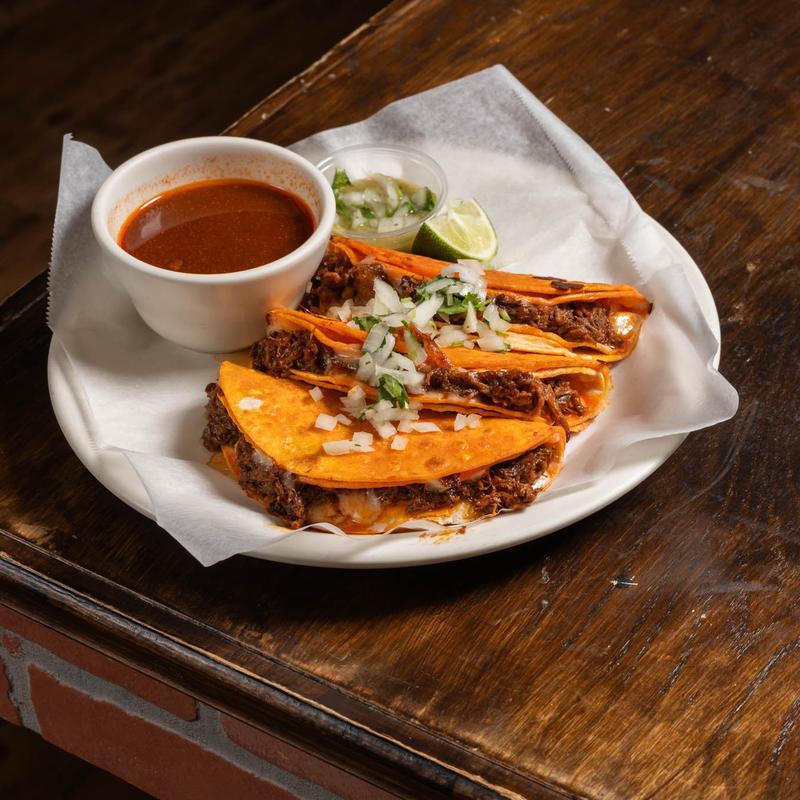 Three quesadillas with barbacoa onion, cilantro with consome.